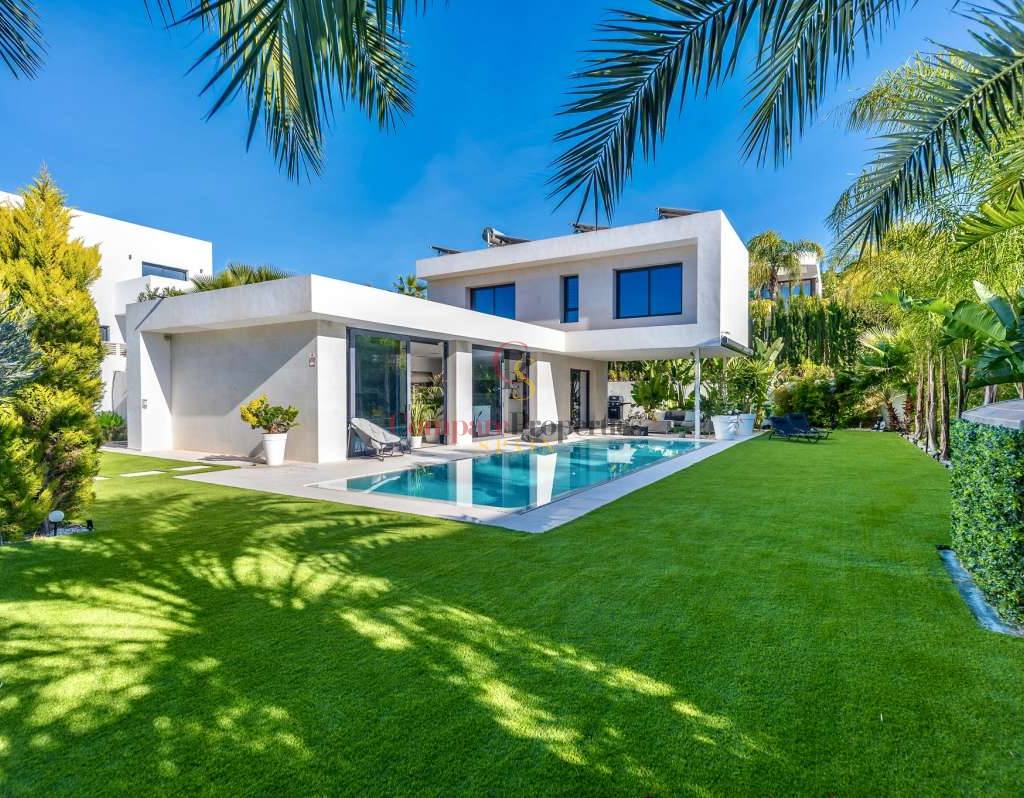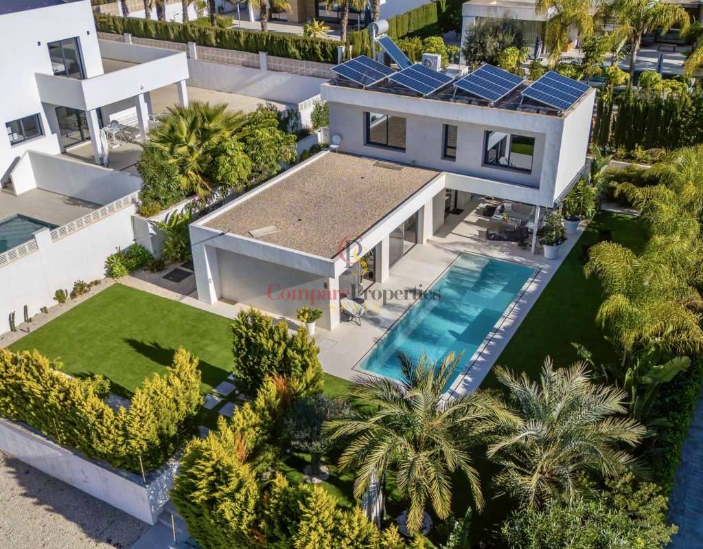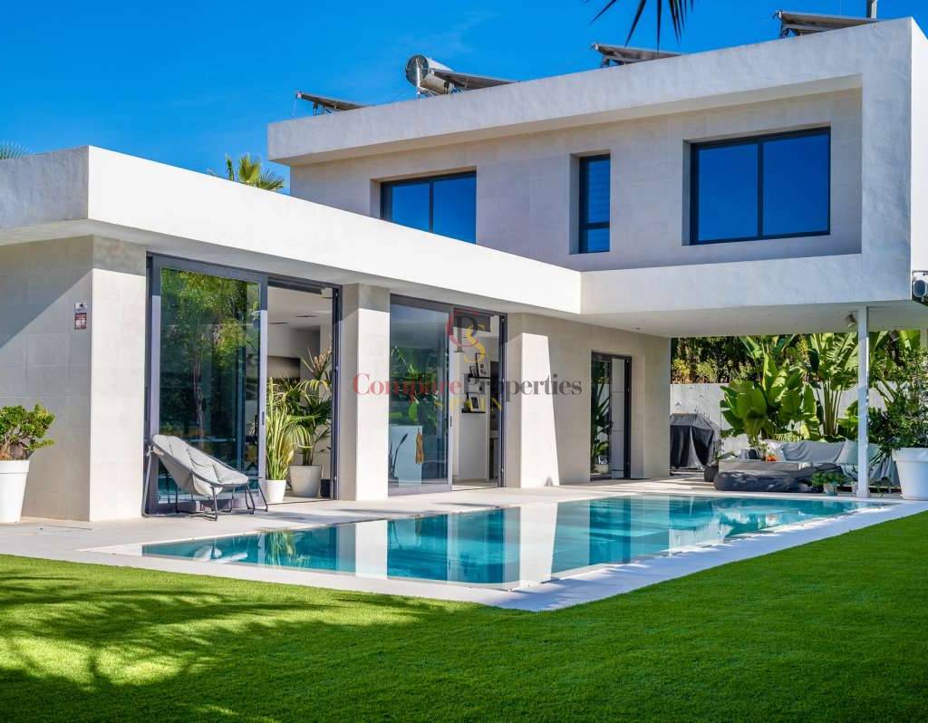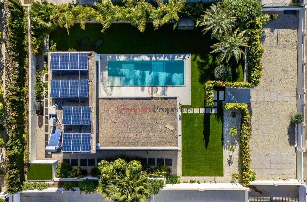 Welcome to The Sun, a modern, energy-efficient villa designed for those who value privacy, comfort, and a high-quality lifestyle. Built in 2018 and set on a generous 800 m² plot, this elegant home offers complete tranquility while remaining within walking distance of the beach, shops, restaurants, and all daily amenities.Prime LocationTucked away on a quiet one-way street, the property enjoys exceptional peace and privacy. There is no through traffic, only the soft sound of palm leaves and water. Despite this calm setting, everything you need is within a 15-minute walk – sandy beaches, seaside promenades, supermarkets, cafés, the charming old town, and scenic nature areas including the nearby salt lake with flamingos and running paths. A car becomes almost unnecessary for daily life.Privacy Without CompromiseUnlike properties with busy sea-front exposure, this villa offers real silence. No street noise, no tourist crowds – just authentic calm. The thoughtfully landscaped garden, with palm trees, strelitzias, lush greenery, and multi-level design, creates a natural screen and a pleasant microclimate. It truly feels like your own private oasis.Outdoor LivingThe highlight is the spectacular 10 × 4 m infinity pool, reaching depths of up to 1.8 m and equipped with an ozonation system for crystal-clear water without harsh chemicals. Surrounding it is a low-maintenance tropical garden with premium synthetic grass, shaded terraces, and a pergola-perfect breakfast area. A dedicated BBQ zone makes evenings by the pool unforgettable.Interior LayoutGround FloorWelcoming entrance hallGuest toiletStorage and separate laundry roomBright open-plan kitchen and living area (~50 m²)Large panoramic windows filling the home with sunlightDirect access to the terrace and gardenThe modern kitchen features a large stone island and top-of-the-line Miele appliances, including induction hob with built-in hood, oven, microwave, fridge, and freezer.Upper FloorTwo spacious bedrooms with fitted wardrobesMaster bedroom with a 160 × 200 cm bedSecond bedroom with two 90 × 200 cm bedsStylish family bathroomRemote Work ReadyA dedicated workspace is integrated into the living area with a large ergonomic desk, comfortable chair, printer, and two 27” UHD monitors. Thanks to ultra-fast 600 Mb/s fiber internet, video calls and large file transfers are seamless. The exceptional silence makes it ideal for focused remote work – even meetings on the terrace are disturbance-free.Smart & Sustainable Living14 photovoltaic solar panels + 10 kWh battery storageSolar collectors for hot waterSmart home system controlling security, climate, and lightingAlarm and cameras accessible via mobile appIntelligent garden irrigation systemEnergy-efficient, low-maintenance designEnjoy almost free electricity and drastically reduced utility bills.Parking & SecurityPrivate gated parking for 5–6 cars, including space for a camper vanEV charging socket (220V)Automatic entrance gateLocated in a quiet detached housing area with no apartment blocks or short-term rentalsReady to Move InThe villa is sold fully furnished and equipped – exactly as seen in the photos. Just bring your suitcase and start living. The property also includes garden storage, an extra freezer, washer, and dryer.Future PotentialIncluded in the price is an approved extension project allowing expansion to 5 bedrooms and 4 bathrooms, making this an outstanding long-term investment.This is more than a house – it’s a lifestyle.