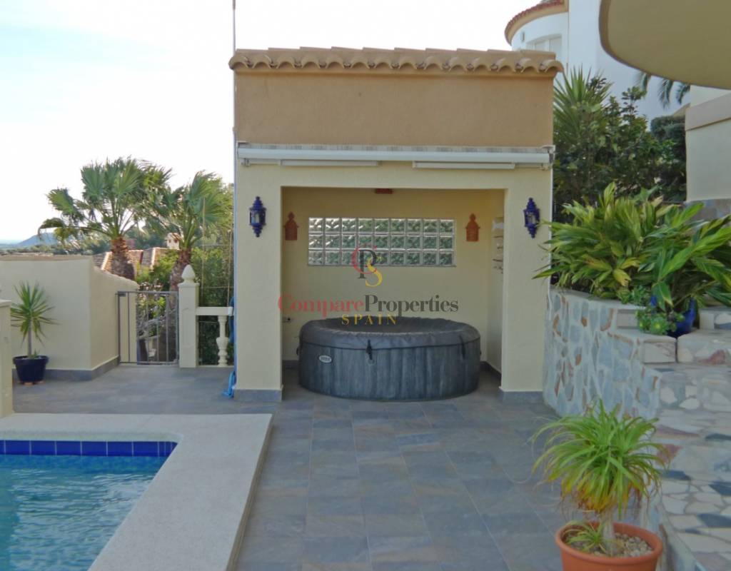 The exterior is simply spectacular: an 8 x 4 meters swimming pool with beautiful views, a covered jacuzzi next to the pool, and a charming, low-maintenance Mediterranean garden that invites relaxation and enjoyment all year round. At street level, there is a practical covered pergola.