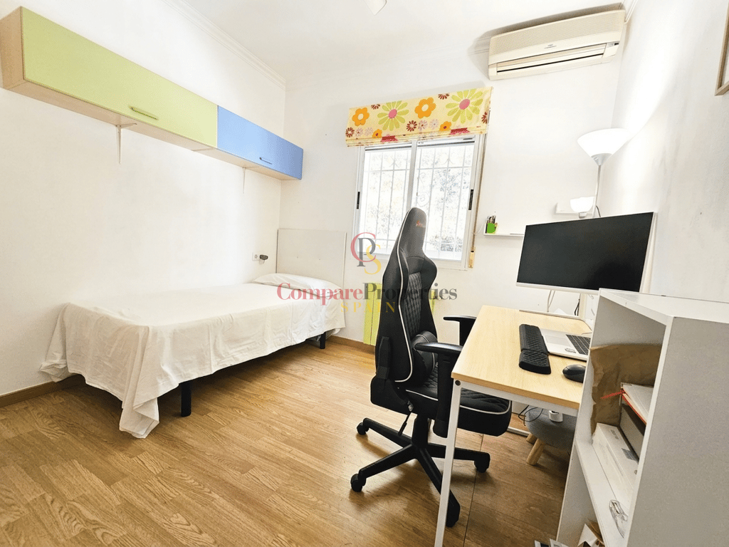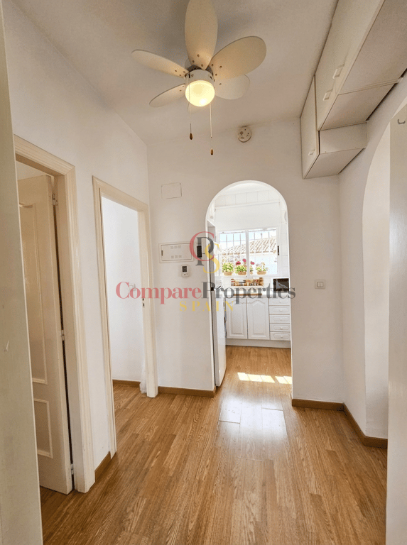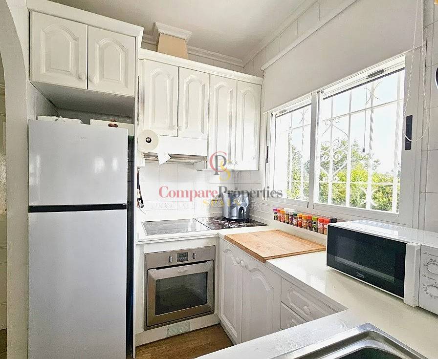 The interior is characterized by its bright, practical layout. The living-dining room flows effortlessly out to the terrace, creating an airy and spacious atmosphere. The kitchen comes fully equipped with appliances, and the home is offered fully furnished, making it truly ready for you to move in today.